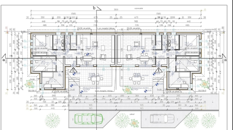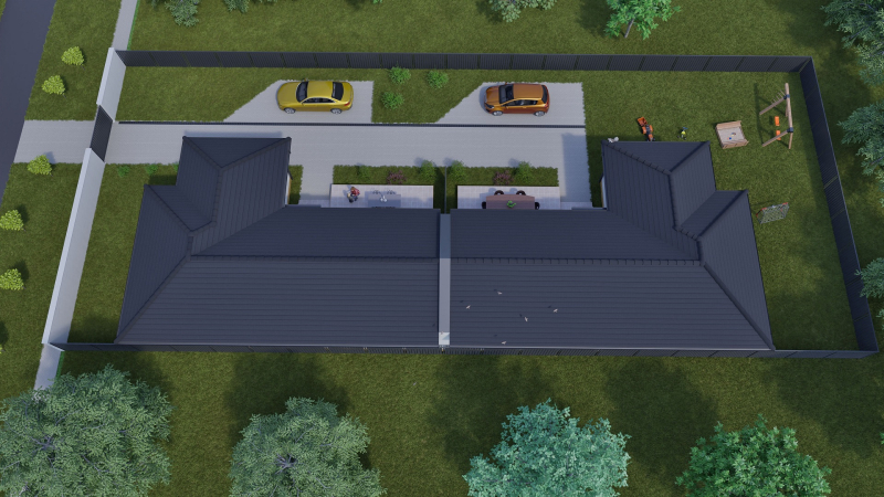 A 754 m2-es telken megosztott kettő 93 m2-es ház épül. A ingatlan előtt egy- egy kocsi parkolási lehetőséggel.