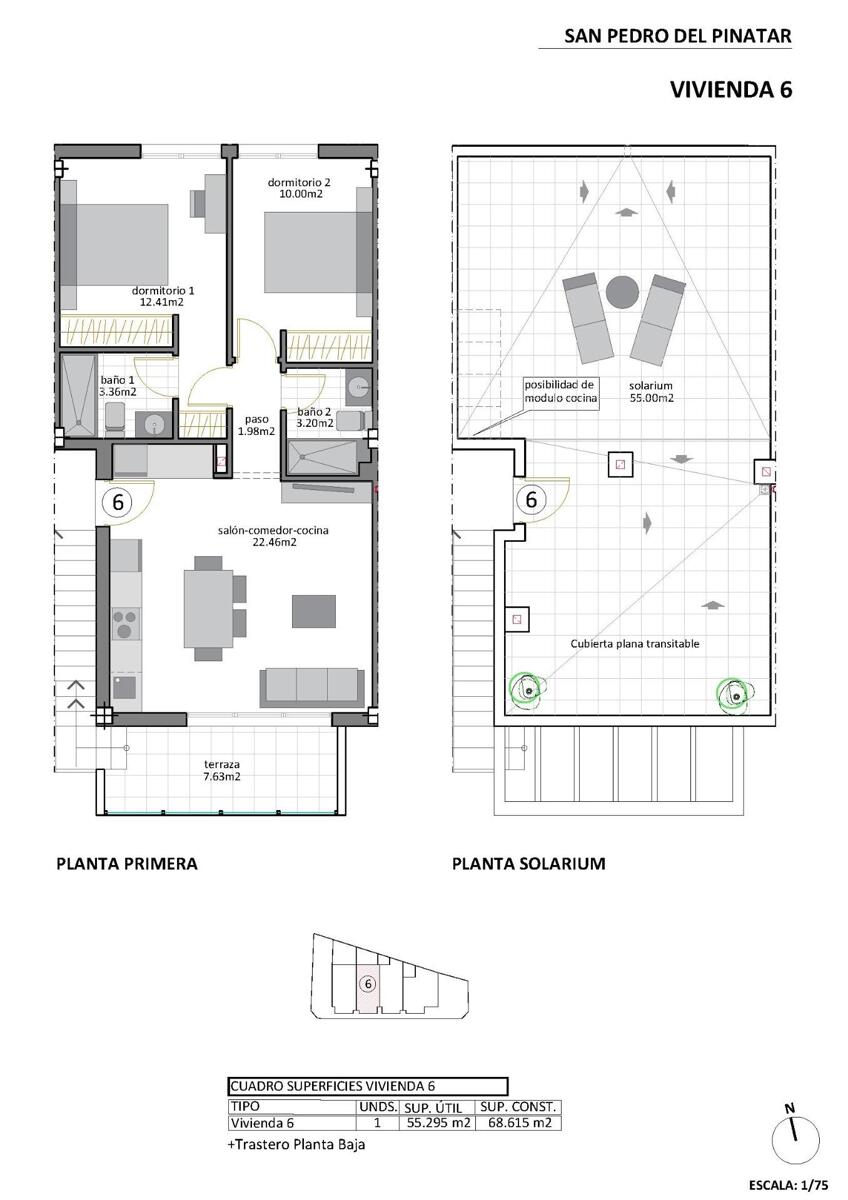 Exkluzív butik stílusú házak a tengerpart közelében Fedezze fel ezeket az elegáns, új építésű bungalókat San Pedro del Pinatar szívében, mindössze 500 méterre a Mar Menor lenyűgöző strandjaitól. Ez a butikfejlesztés mindössze nyolc jellegzetes otthont foglal magában, amelyek ötvözik a modern dizájnt, a kényelmet és a nyugodt tengerparti életmódot. Elérhető modellek az életstílusodhoz Kert/földszinti modell: Elülső terasszal és tágas hátsó terasszal rendelkezik, amely tökéletes a szabadtéri élethez. Penthouse tetőtéri modell: Saját tetőtéri szoláriummal és elülső terasszal rendelkezik, ahonnan nyílt kilátás nyílik és rengeteg napfény várja a vendégeket. Kert/földszinti modell részletei Lépjen be egy világos nappaliba, amely zökkenőmentesen kapcsolódik az étkezőhöz és a teljesen felszerelt konyhához. A nagyméretű üveg tolóajtók beengedik a természetes fényt, nyitott és hívogató hangulatot teremtve. Az elrendezés két tágas hálószobát tartalmaz, a fő hálószobában saját fürdőszoba, valamint modern családi fürdőszoba található. A penthouse modell főbb jellemzői A penthouse-ba egy privát lépcsőn keresztül lehet bejutni, amely egy nagy teraszra vezet. A belső térben egyterű nappali és étkezősarok teljesen felszerelt konyhával párosul. Két hálószoba tartozik hozzá, a fő hálószoba pedig saját fürdőszobával rendelkezik. A konyhából megközelíthető, saját tetőtéri szolárium ideális helyszín a pihenéshez vagy a szórakozáshoz. A földszinti további tárolók biztosítják a kényelmet. Főbb jellemzők és kényelmi szolgáltatások Belső és külső LED világítás. Teljesen felszerelt konyha indukciós főzőlappal, sütővel, mosogatógéppel és hűtőszekrénnyel/fagyasztóval. Légkondicionáló telepítve. Kijelölt parkolóhely. Parkosított közösségi kert medencével a lakók számára. San Pedro del Pinatar: Tengerparti varázs és kényelem A gyönyörű Mar Menor és a Földközi-tenger partján található San Pedro del Pinatar a vízi sportok, a vitorlázás szerelmeseinek és a strand szerelmeseinek menedéke. A közeli Lo Pagán terület természetes iszapfürdőkkel, nyugodt vizekkel és egész évben elérhető szolgáltatásokkal, többek között üzletekkel, éttermekkel és szabadidős létesítményekkel várja vendégeit. Távolságok a legfontosabb látnivalóktól: Dos Mares bevásárlóközpont: 5 km Murcia/Corvera repülőtér: 30 km Alicante repülőtér: 75 km Helyi golfpályák: 10?20 km Kikötő és vitorlásklubok: 2 km Foglalja le álmai otthonát még ma A befejezést 2025 végére tervezik, így itt az ideje, hogy biztosítsa új otthonát San Pedro del Pinatarban. Ne hagyja ki ezt a lehetőséget, hogy élvezze a modern elegancia és a tengerparti nyugalom keverékét. Lépjen kapcsolatba velünk még ma, ha többet szeretne megtudni, vagy megbeszélheti a látogatást!