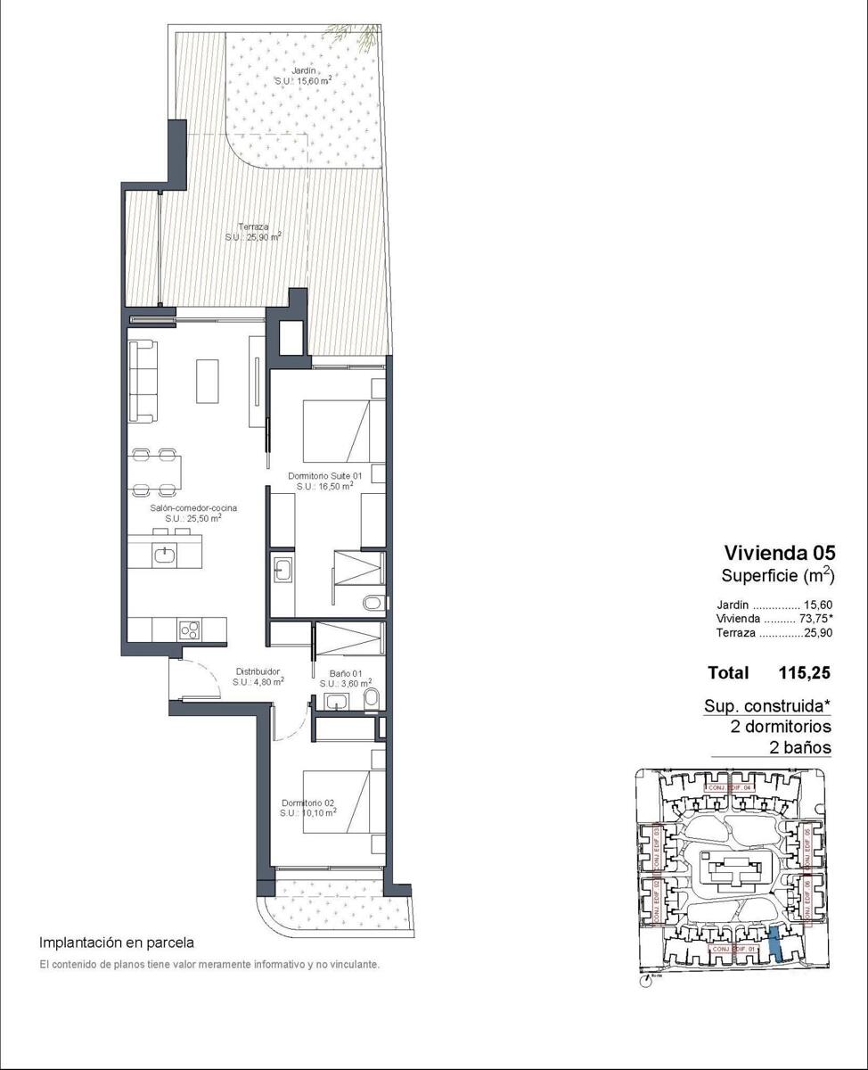 Modern dizájn és maximális kényelem mediterrán környezetben Fedezze fel ezt a látványos lakókomplexumot Lo Marabúban, Ciudad Quesadában, amely 80 2 és 3 hálószobás otthonból áll, 2 fürdőszobával. A modern és hatékony megközelítéssel tervezett ingatlanok tágas teraszokat, keresztszellőzést és kiváló minőségű felületeket kínálnak a kényelem és az energiahatékonyság maximalizálása érdekében. A földszinti ingatlanok saját kerttel rendelkeznek, míg a legfelső emeleti ingatlanok saját szoláriumokkal rendelkeznek, előre telepítve a jakuzzi és a szabadtéri zuhanyzó számára. Ezen kívül a fejlesztés kertekkel körülvett közös medencékkel rendelkezik, amelyek tökéletes környezetet teremtenek a pihenéshez és a vidámsághoz. Kiváló minőségű funkciók az exkluzív életmódhoz Minden otthont úgy terveztek, hogy maximális kényelmet nyújtson, kiváló minőségű anyagokkal és modern dizájnnal: Nagyméretű alumínium tolóablakok hőtöréssel. Motoros redőnyök a nagyobb kényelem érdekében. Climalit 4+4/14/4/4+4 üvegezés hő- és hangszigeteléshez. Páncélozott bejárati ajtó biztonsági zárral. Teljesen felszerelt konyha elektromos készülékekkel. Fürdőszobák bútorokkal, tükrökkel és zuhanyfalakkal. 150 literes légtermikus rendszer meleg vízhez. Légcsatornás légkondicionáló teljes körű telepítése (meleg/hideg). Világítás minden helyiségben már beépített. Parkolóhely a csomagban. A dupla homlokzati kialakításnak köszönhetően az otthonok természetes keresztszellőzést kínálnak, nyáron hűvösséget biztosítva és csökkentve a légkondicionálás energiafogyasztását. Kiváltságos helyen található Ciudad Quesada Lo Marabú egy exkluzív lakónegyed Ciudad Quesadában (Rojales), természeti terekkel körülvéve, és minden szolgáltatás könnyen elérhető. Az urbanizáció nagyon közel van La Mata és Torrevieja sós tavaihoz, ideális környezet a természet élvezetéhez és a közérzet javításához. Új otthonából gyorsan elérheti a környék főbb látnivalóit: Guardamar del Segura és Torrevieja strandok - 10 km (15 perc autóval). Alicante-Elche repülőtér (ALC) - 38 km (35 perc autóval). Murcia-Corvera repülőtér (RMU) - 65 km (50 perc autóval). Tekintélyes golfpályák - Kevesebb, mint 5 km. Bevásárlóközpontok és éttermek - Csak néhány percre. Gyors hozzáférés az AP-7 és N-332 autópályákhoz, amelyek összekötik az egész Costa Blancát. Tökéletes otthon a Földközi-tenger élvezetéhez A modern dizájn, a stratégiai elhelyezkedés és a kivételes természeti környezet kombinációjával ezek a Lo Marabu-i otthonok ideálisak állandó lakóhelynek, nyaralónak vagy befektetési ingatlannak. Ne hagyja ki ezt az egyedülálló lehetőséget. Lépjen kapcsolatba velünk még ma, ha további információra van szüksége, vagy hogy megbeszélje jövőbeli otthonának megtekintését Ciudad Quesadában.