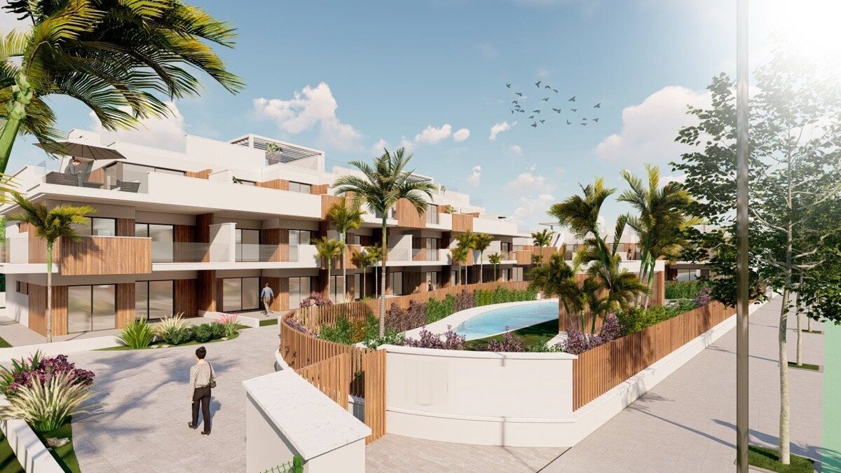 ÚJ ÉPÍTÉSŰ LAKÓKOMPLEXUM PILAR DE LA HORADADÁBAN Új építésű, modern stílusú lakókomplexum bungalókból, apartmanokból és penthouse-okból áll, nagy közös kerttel, medencével, edzőteremmel és játszótérrel a gyerekek számára. Gyönyörű ingatlanok 2 és 3 hálószobával, földszinti bungalók saját kerttel, apartmanok terasszal és penthouse-ok saját szoláriumokkal. Minden ingatlanhoz tartozik garázs és tároló az alagsorban. A fejlesztés egy verhetetlen enklávéban található, Pilar de la Horadada nagy lakónegyedében, amely kiváltságos hely a családok számára, hogy könnyen hozzáférjenek mindenféle szolgáltatáshoz. Pilar de la Horadada egy tipikus spanyol falu a Costa Blanca legdélebbi részén. A nagy főutcán szupermarketek, sok üzlet, étterem és bár, valamint néhány szép tér található. Torre de la Horadada és Mil Palmeras gyönyörű strandjai finom homokos sétánycal mindössze 5 percre találhatók. Corvera (Murcia) és Alicante repülőtere 40, illetve 55 percre található.